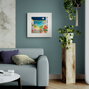 Experience the allure of coastal living with 'Cat Watching the Yachts Sail Home, St Ives'. This 18 x 18-inch oil on canvas captures the captivating full moon and the stunning movement of the tide. A black-and-white cat perched on railings, red geraniums, and the inky sky add charm to this piece by Cornish artist Joanne Short. Invest in this piece from our Cornwall art gallery and enjoy a touch of seaside life in your home.