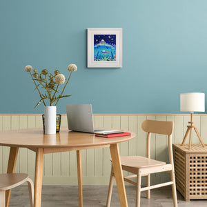 Discover this captivating painting of St Michael’s Mount, Cornwall by renowned Cornish artist John Dyer. This 12x10 inch acrylic on canvas takes the viewer to a vibrant night sky full of stars, as people and boats gather to witness a majestic whale showcasing its tail as people and dolphins take in the excitement. The painting is a celebration of nature with wildlife, blue echiums and Cornish flowers. A stunning painting that will bring joy to all who view.