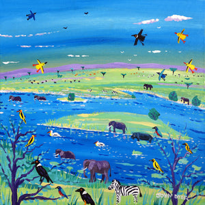 This 18x18 inch acrylic on canvas painting depicts a stunning wildlife scene in Amboseli, Kenya. From Observation Hill, the view captures a variety of animals including elephants, weaver birds, hippo, and pelicans. British Artist John Dyer, has skilfully captured the beauty of the Kenyan savannah and lagoon. Enjoy Africa every day in your home with this unique painting.
